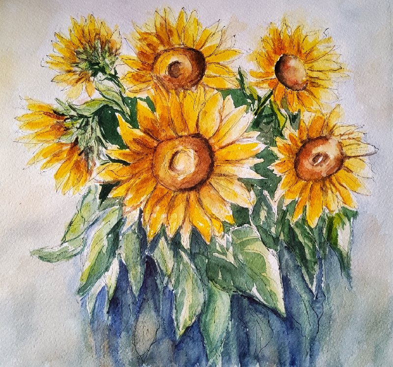 Wenn die Sonnenblumen blühen, weiß man, dass der Sommer nicht mehr lang dauern wird… Nach einem Strauß, den mir eine Freundin geschenkt hat, entstand dies Aquarell.