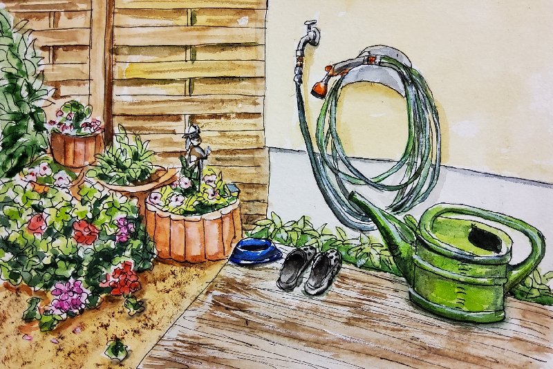 This time it’s obvious: everywhere in this garden you find small, bright blue objects (here a bowl for the cat), which add contrast and interest to my pictures…