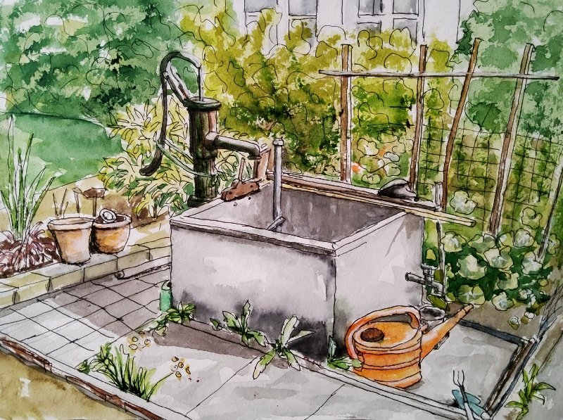 Well, here you don’t see a lot of her garden – this is her back porch where she invited me to coffee and fresh apple tart. The hostess being in the picture, she said it would be nicer with me there, too – so next time I’ll ask someone else to take a picture with me in it as reference for my watercolour!