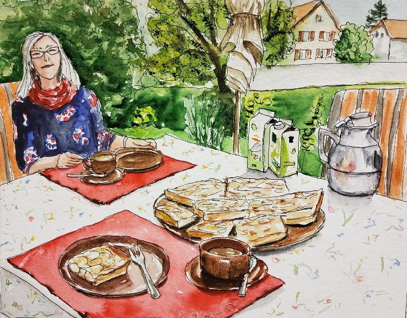 Naja, vom Garten sieht man nicht viel, das war Kaffee und frischer Apfelkuchen auf ihrer Terrasse. Am Tisch die Gastgeberin! Angela meinte, es wäre Zeit, mich mal selbst mit in einem Bild festzuhalten – mal sehen, demnächst muss mich mal jemand fotografieren, dass ich danach zeichnen kann…