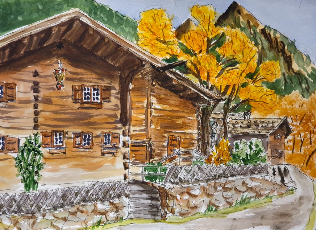 Yesterday, I made a little hiking tour in the Alps near Oberstdorf, visiting the historical farmhouses of the village Gerstruben. Sitting on the edge of a well, I did some of them in the „line-and-wash“ watercolour style (above). In my next post this week you’ll find the best photos of this tour with a lot of information about it!