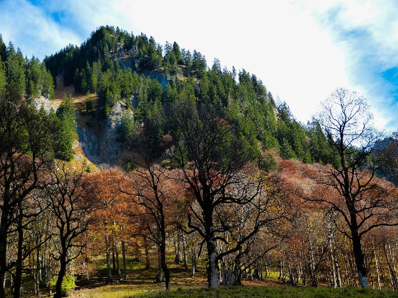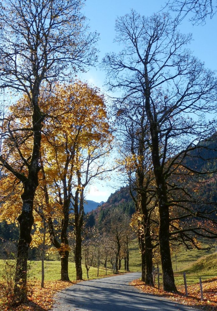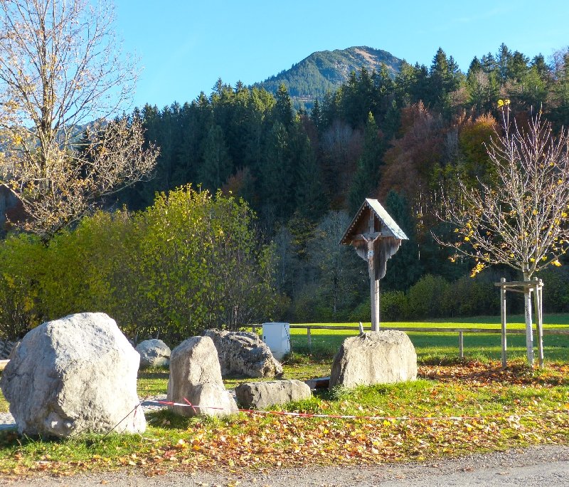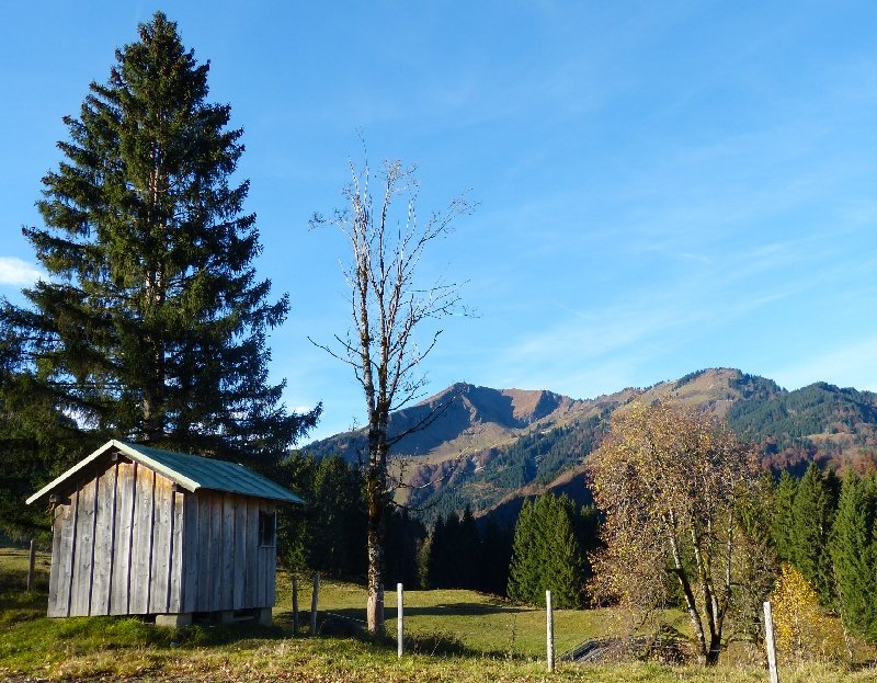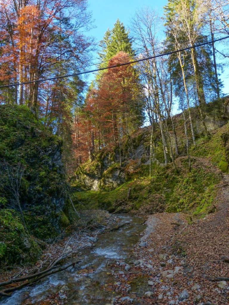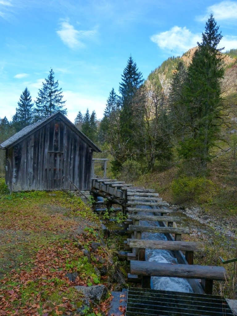 Nach Gerstruben gibt es zwar eine Fahrstrasse, doch die ist Leuten mit besonderer Erlaubnis der Gemeinde vorbehalten, alle anderen müssen zu Fuß (oder mit dem Mountainbike) hinauf. Für Wanderer gibt es 3 Möglichkeiten: die Fahrstrasse (langweilig), den Hölltobel (interessant und abenteuerlich, aber der Schwierigkeitsgrad für meine Knie ungeeignet), und schließlich den Rautweg, durch den Wald, über Stock und Stein, teils auch steil, aber gut machbar. Den Letzteren wählte ich.