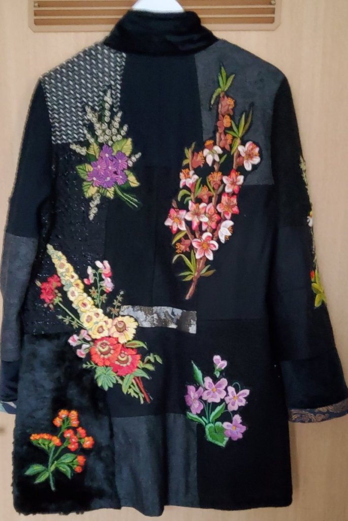 Dieses Teil war ganz schön viel Arbeit… Ein Gehrock-Schnitt (Kurzmantel), den ich zunächst als Patchwork aus lauter schwarzen/schwarzgrundigen Stoffresten (Wolle, Jeans, Samt, Kunstfell etc) zusammengesetzt habe, bekam dann jede Menge bunte Applikationen. Dafür habe ich ausgeschnittene, alte Stickereien verwendet, die ebenfalls auf schwarzem Grund gearbeitet waren – gesammelt im Lauf der Jahre auf Flohmärkten. Die goldenen Knöpfe sind ebenfalls vom Flohmarkt, der ganze Mantel ist gefüttert.