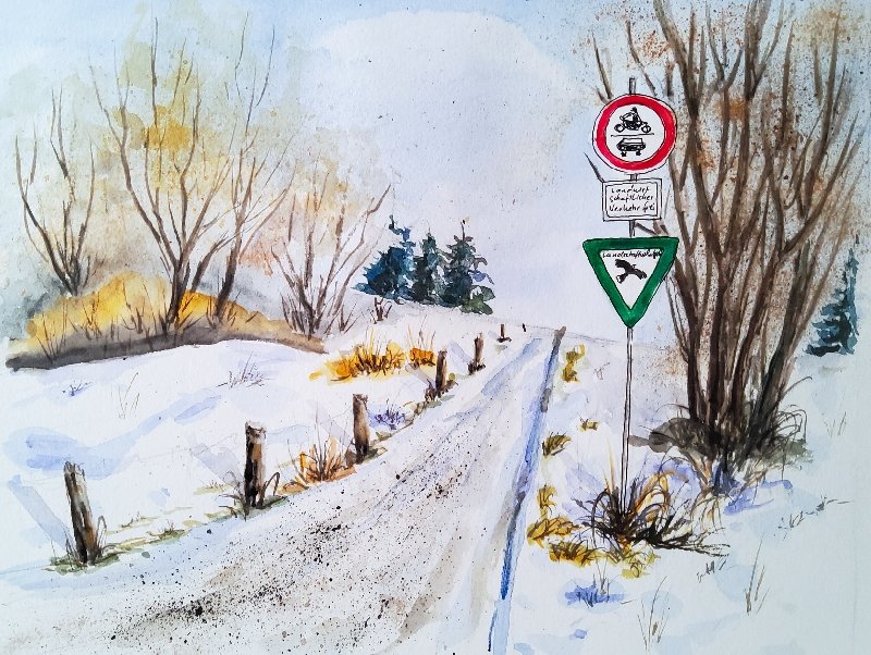 Another winter watercolour, inspired by my walk in the surroundings of Friedberg. This time, there was no reference photo, I did it from memory – even the sign, because there are lots of these in the area.
