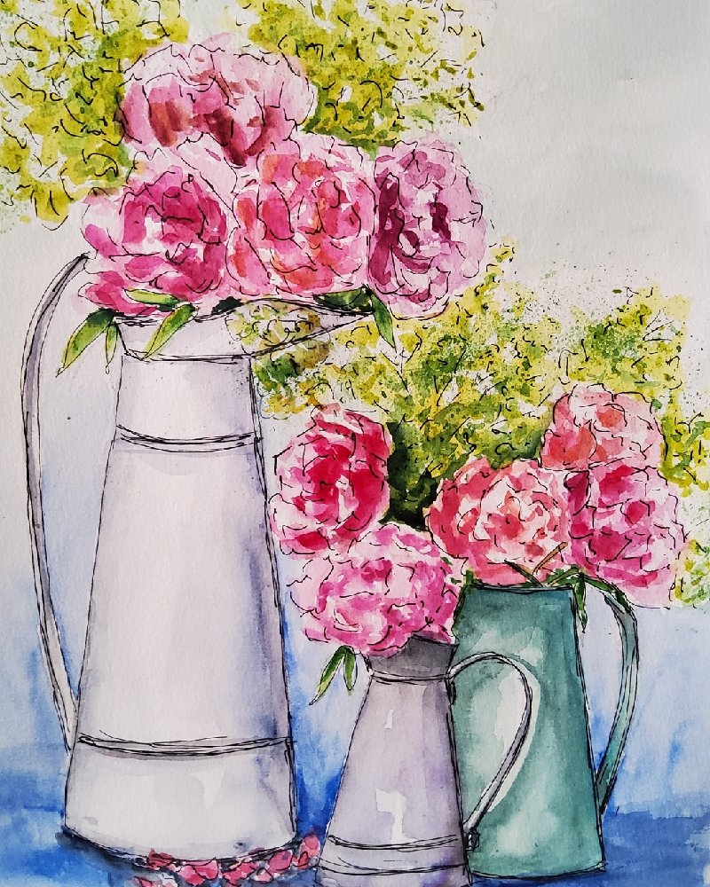 This picture has been done a 10 minutes walk away from my place. Also, it was a first try with my new materials: the „etchr Perfect Sketchbook“ and the „Memory Point“ brushes by KUM. Both are a joy to work with! The sketchbook features a 300g cold press cotton paper, artist’s quality. It’s a bit on the expensive side, but worth it. The paper does very well for wet-in-wet painting as well as when working with masking fluid. The colours show beautifully, too! As for the brushes made in Germany, they are true to their name (Memory Point), the special synthetic fibre holds a lot of paint and is easily controlled. If you don’t prefer the very soft natural sable brushes but, like me, more pressure resistant brushes, these are very recommendable: despite the high quality they are quite affordable and thus balance the cost of the sketchbook…