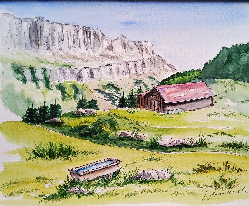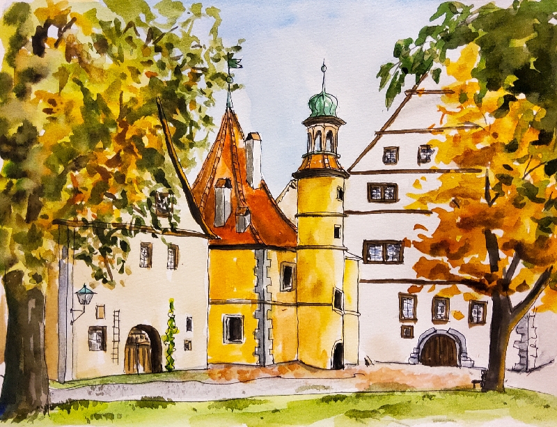 Dieses Bild habe ich hier in Augsburg-Hochzoll gemalt. Es war auch ein Test neuen Materials: das „etchr Perfect Sketchbook“ und die Memory Point Pinsel von KUM. Von beidem bin ich sehr angetan, ja begeistert! Das Sketchbuch hat ein 300g Papier aus Baumwolle in Künstlerqualität, das zwar etwas mehr kostet als die von Hahnemühle, aber sowohl beim Nass-in-Nass-Malen als auch beim Arbeiten mit Rubbelkrepp und beim Radieren der Vorzeichnung keine Probleme macht. Im nassen Zustand wellt es sich nur minimal, nach dem Trocknen liegt es wieder ganz glatt. Die Farben kommen wunderschön – kurz, sehr empfehlenswert! Ebenso die Pinsel aus speziellem Kunsthaar, made in Germany(!), die machen ihrem Namen (Memory Point) alle Ehre. Nun ist es natürlich persönliche Sache, ob man die sehr weichen Marderhaar Pinsel mag oder, wie ich, ein wenig Druckwiderstand bevorzugt. Vorteil hier: die Pinsel sind trotz der Qualität durchaus erschwinglich und gleichen so den Preis des Buches wieder aus…