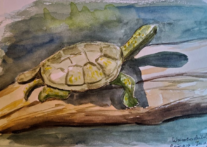 Und dann war da noch irgendwo ein tropischer Teich mit Wasserschildkröten – eine sonnte sich so reglos, dass ich genug Zeit hatte, auch sie zu zeichnen.
