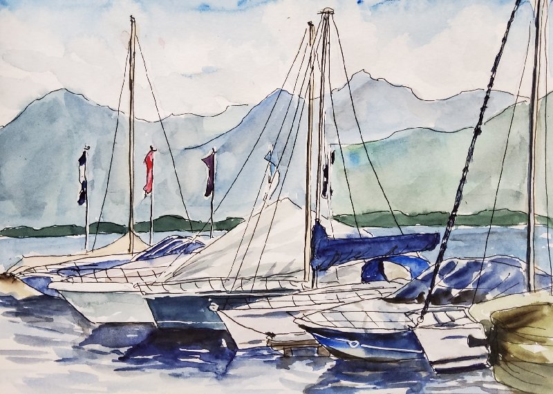 Im Hafen von Locarno habe ich versucht, die Boote festzuhalten – ganz schönes Durcheinander, das man sehr vereinfachen muss beim Zeichnen. Das muss ich noch etwas üben…