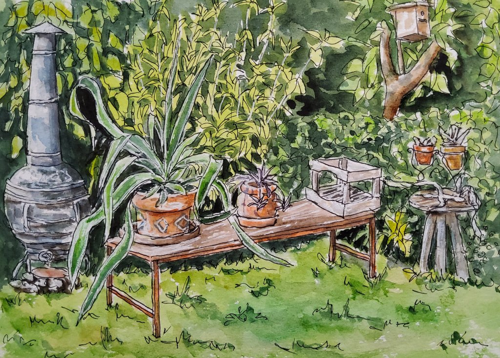 During the summer months I’ve taken a lot of pictures in various gardens as reference for sketching. These two watercolours show nice corners in the garden of my friend Elke.