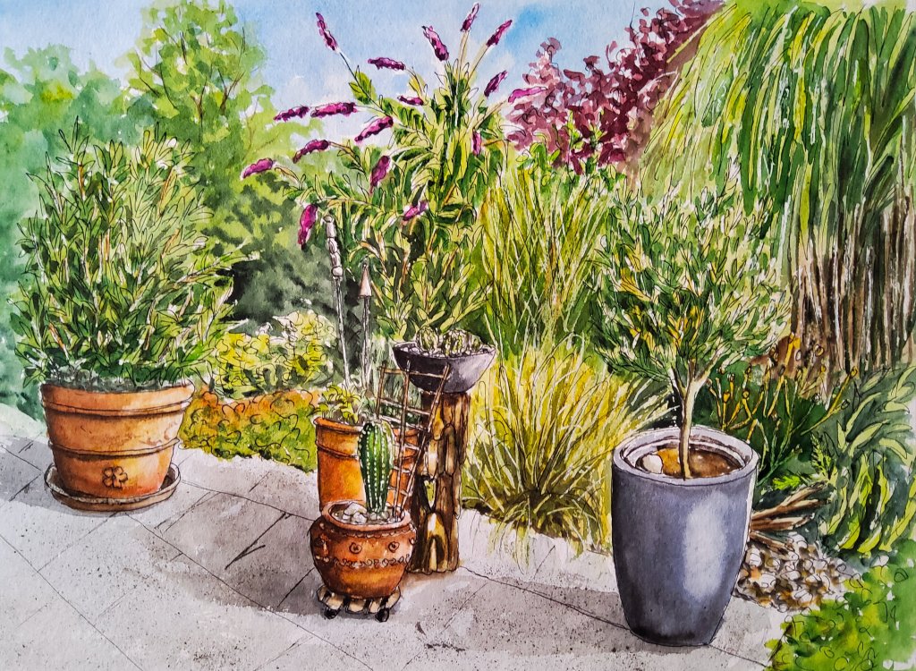 Den Sommer über habe ich viel in Gärten fotografiert, um Motive zum Zeichnen zu sammeln. Hier zwei hübsche Ecken im Garten meiner Freundin Elke.