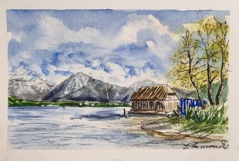 After my second knee surgery I’m now staying in Bad Wiessee on lake Tegernsee for physical therapy. This is a beautiful region! I’ve already started to catch some impressions as painted postcards; some in watercolour, one as acrylic.