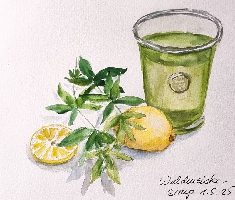 Erstmals habe ich dieses Jahr Waldmeistersirup gekocht und auch dies im Büchlein festgehalten – direkt abgezeichnet, ohne Foto. Dafür hatte ich extra Zitronen und 2 Zweiglein Waldmeister aufgehoben.