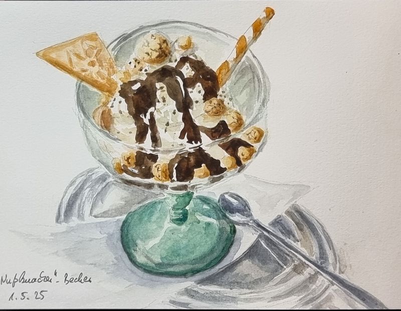 In letzter Zeit habe ich mal wieder zum Sketchbuch und den Aquarellfarben gegriffen. Das Bild oben entstand am 1. Mai – ich habe es vor Ort gemalt. Den Eisbecher unten gab es zwar am selben Tag, doch er ist vom Foto gemalt: ich bin nicht schnell genug, um so etwas vor dem Schmelzen zu zeichnen…