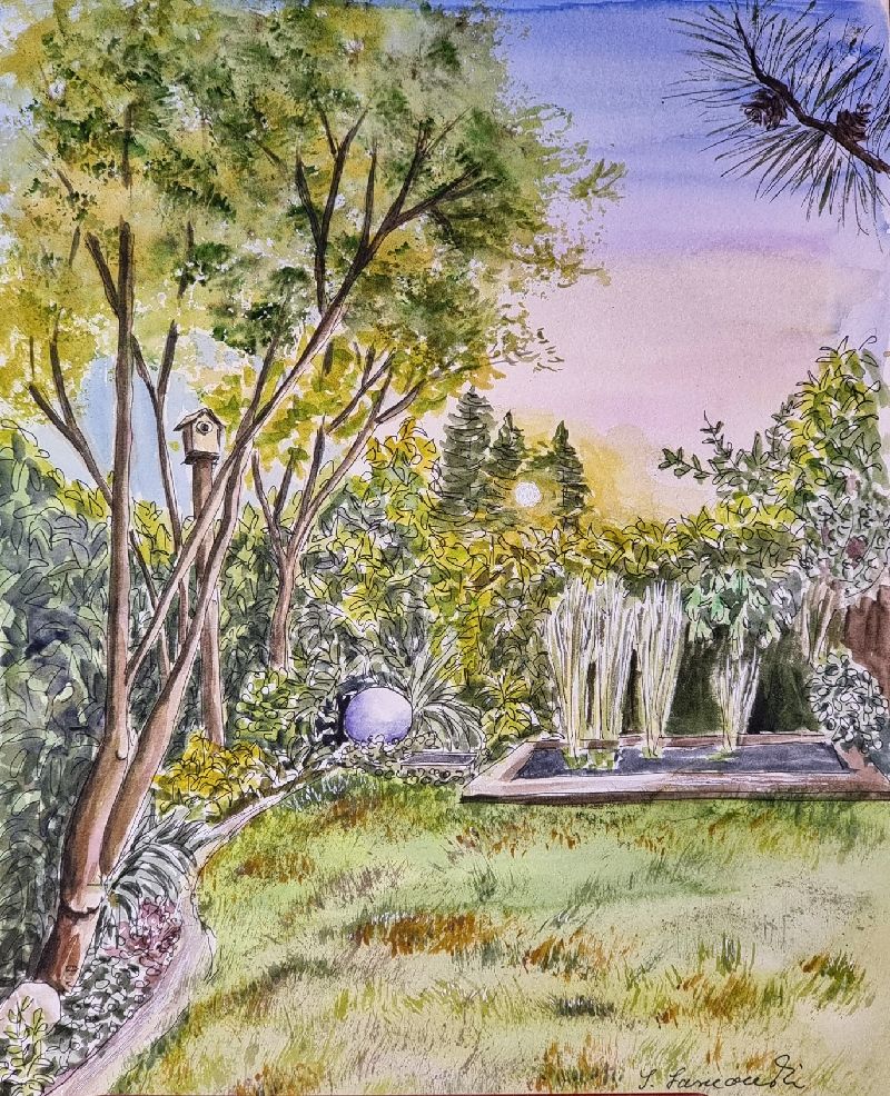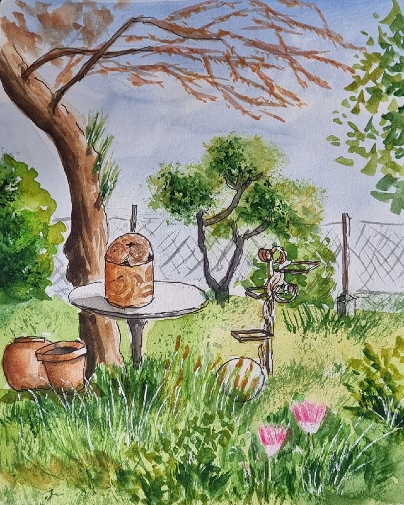 Gardens allways offer nice views for photos and paintings. The picture above shows the Japanese Garden, part of the Augsburg Botanic Garden. This time of year it’s very beautiful with the blooming azaleas. The one below has been done from a reference photo my brother and sister-in-law had sent me , it shows an evening in their garden.