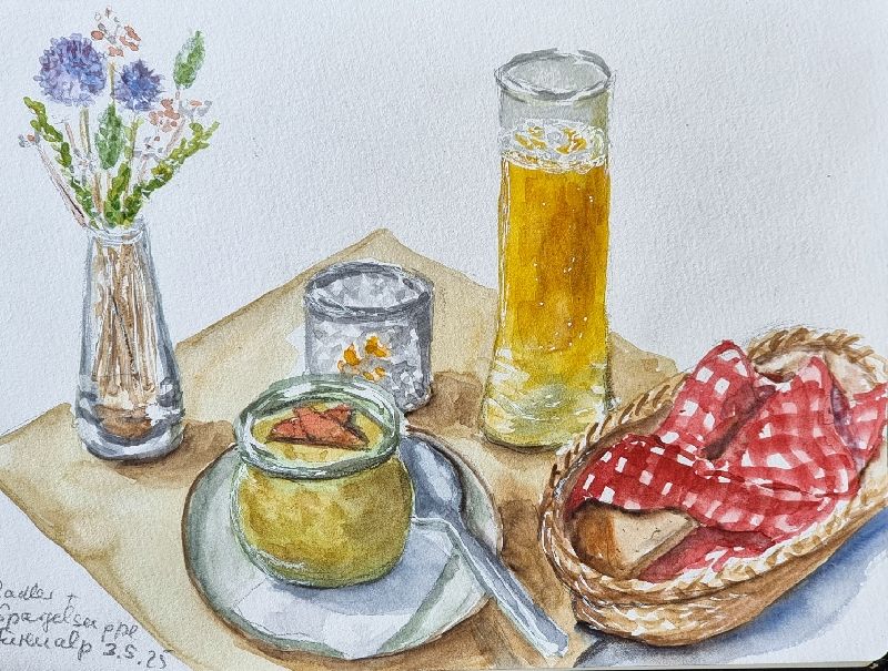 This year, I’ve made woodruff syrup for the first time and done the sketch from the arranged stilllife – having saved two stems of woodruff for this sketch.