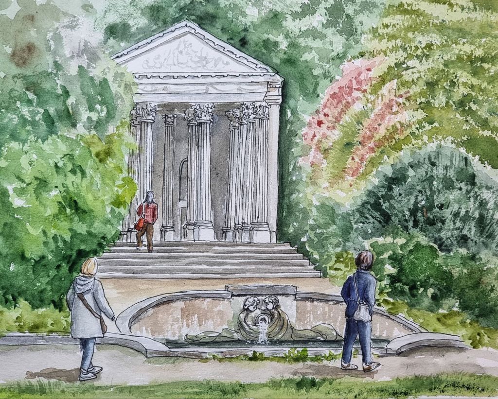 Typisch sind immer wieder kleine, überraschende Ansichten wie alle möglichen romantischen Bauten und künstlichen Ruinen, hier das „Römische Wasserkastell“