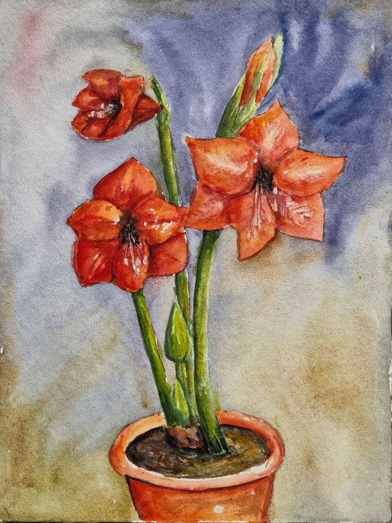 These watercolour studies have been done from nature. By now, I think that perhaps it would have been nice to place both in one picture with the pomegranates in the foreground, behind them the amaryllis… Maybe next time!