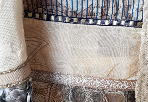 Die Nähte der Patch-Teile sind mit Bändern und Borten besetzt.
