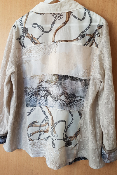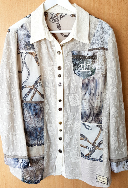 Three old blouses ( two from flea markets) and some left-over material have been used to create this comfortable and classy blouse. The blouses all showed designs in beige, blue and brown tones on very lightweight cotton material. I’ve combined them with two larger pieces of jersey fabric which show lace-like designs and which make the blouse easy to wear because of their stretchiness.