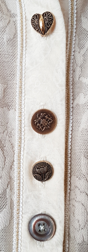 Slim decorative ribbons – also left-over pieces of ribbons – have been used on the patch seams and to frame the button tape. Like on many of my creations, I’ve used different buttons – flea market finds and from the charity shop – which add interest. Also, you can save much money buying bunches of used buttons, because new ones are expensive!