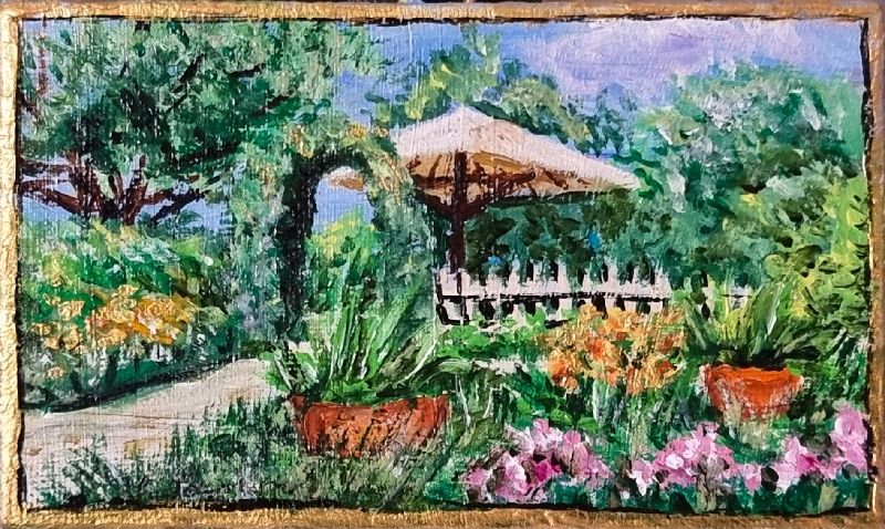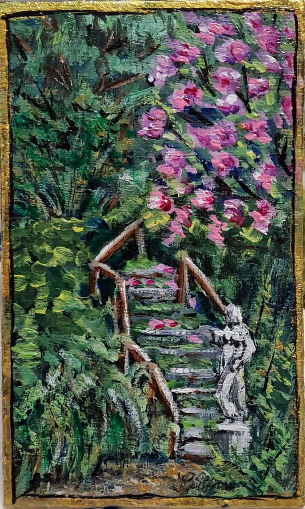 Garden pictures are always fun! Here I’ve done two small cards (12,5×7,5cm) from my own reference photos (freely interpreted).
