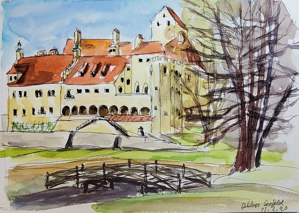Bei den heutigen Wetteraussichten (sonnig, bis zu 14°C) beschloss ich heute früh spontan, einen Tagesausflug zu machen. Nachdem ich in letzter Zeit zwei Bilder gezeichnet hatte, die am Ammersee fotografiert worden waren, zog es mich genau dort hin! Zunächst machte ich jedoch Halt in Seefeld, wo ich das Schloss zeichnete: