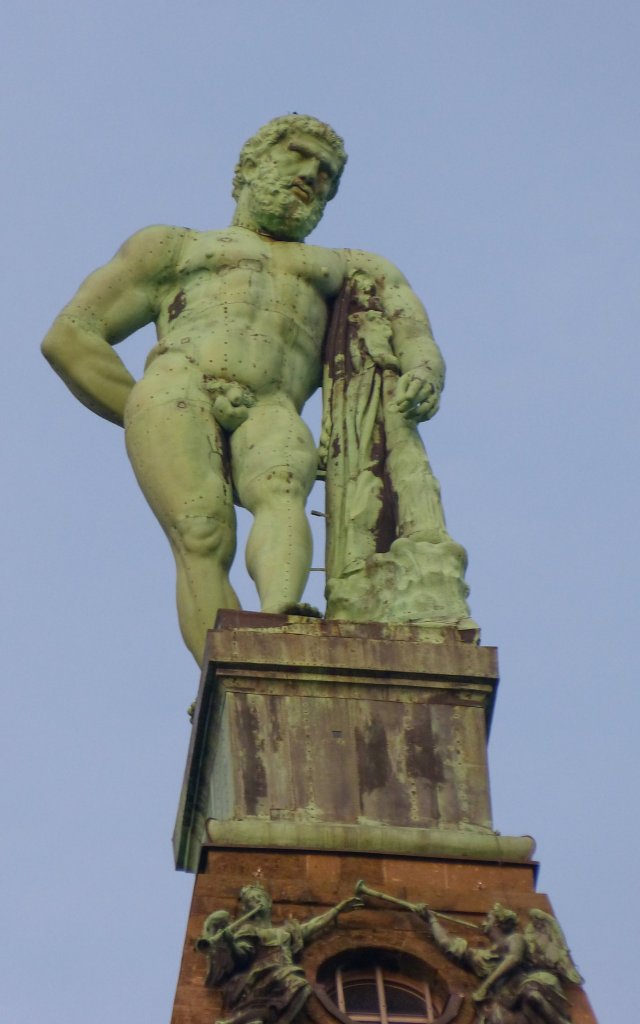 Am Gipfel des Hügels thront eine Herkulesstatue mit Blick nach Osten über einem künstlichen Felsgebilde, zu seinen Füßen die Terrassen der Wasserspiele. Ich war bei Sonnenaufgang am Herkules und blickte über Kassel.