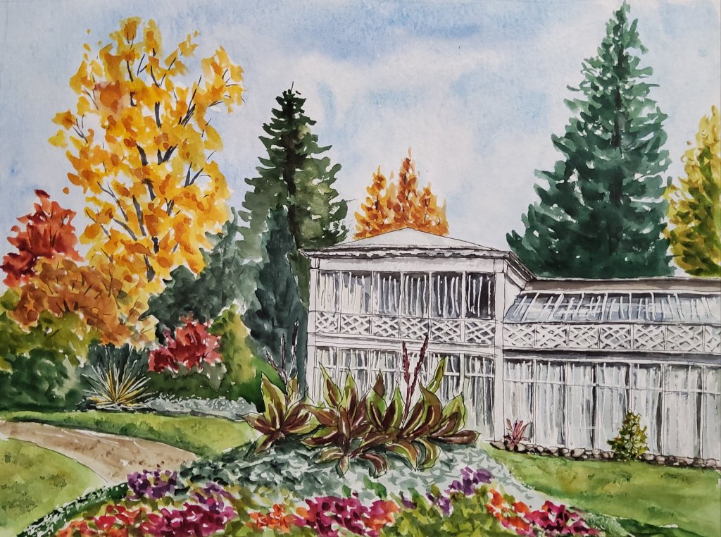 Auch im Mai und Juni muss der Garten sehr schön sein: im unteren Bereich ist ein Rosengarten (hier die letzten des Jahres) und viele Rhododendren! Unten: noch ein paar großartige Bäume…