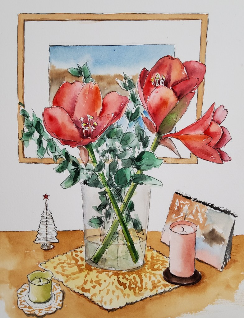 Some days ago I got these lilies – a perfect model for an acrylic painting. Now you can admire them without having to cope with their quite strong (almost nauseating) perfume…
