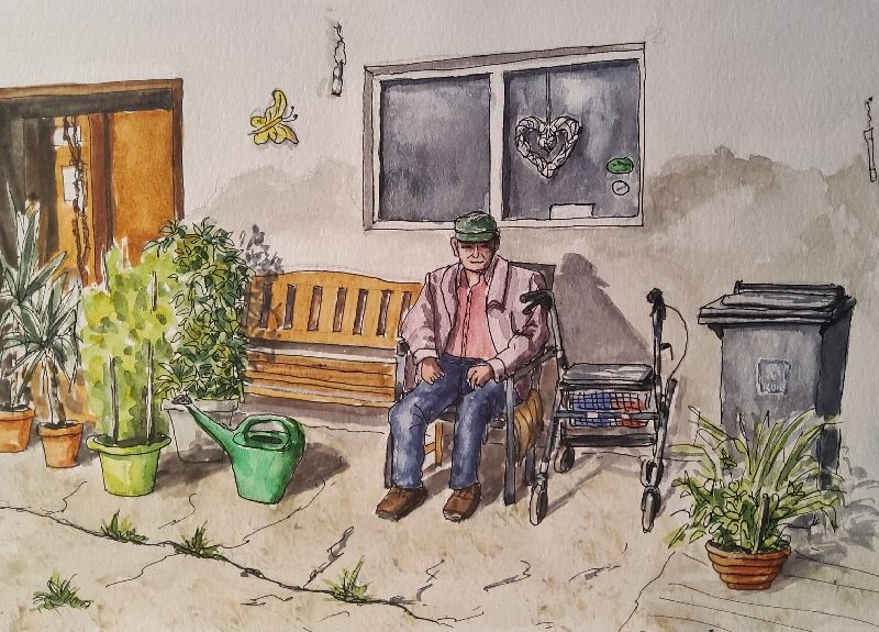 An einem schönen, noch warmen Herbstmorgen erwartete mich dieser ältere Herr bereits vor der Haustür. Ich wusste sofort, dass ich dies Bild zeichnen wollte und bat ihn, ein Foto machen zu dürfen. Erst diese Woche kam ich nun dazu, es mit Aquarellfarben umzusetzen. Wie immer wird er dann das Original erhalten.