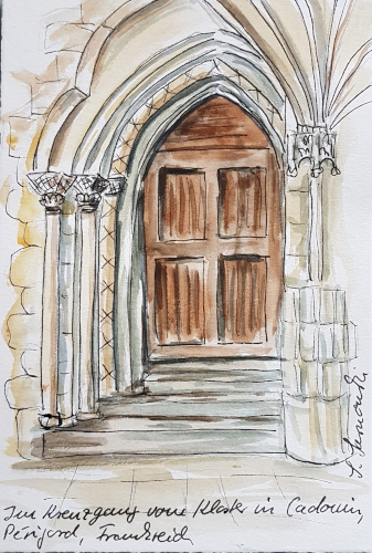 Above: the relief shows the Crucifixion, the mural painting the Annunciation. In my post: „Travel Journal Périgord: day two“ I had shown a watercolour I had done sitting in this cloister: