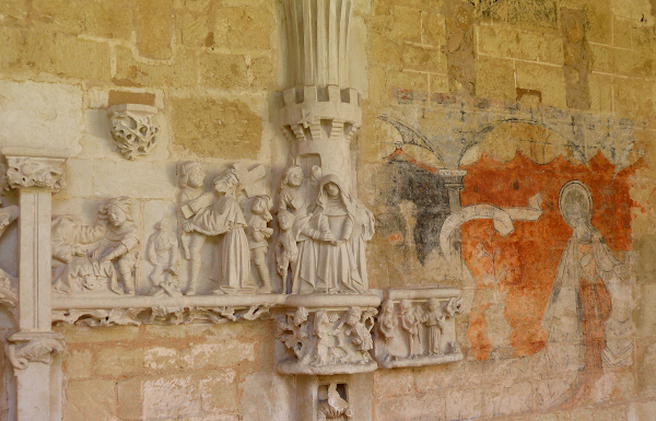 Oben: das Relief zeigt eine Kreuzigungsdarstellung, die Wandmalerei die Verkündigung. In meinem Beitrag „Reisetagebuch Périgord: zweiter Tag“ hatte ich eine Zeichnung gezeigt, die ich hier im Kreuzgang gemacht hatte:
