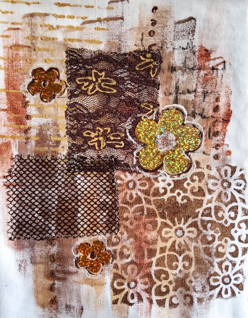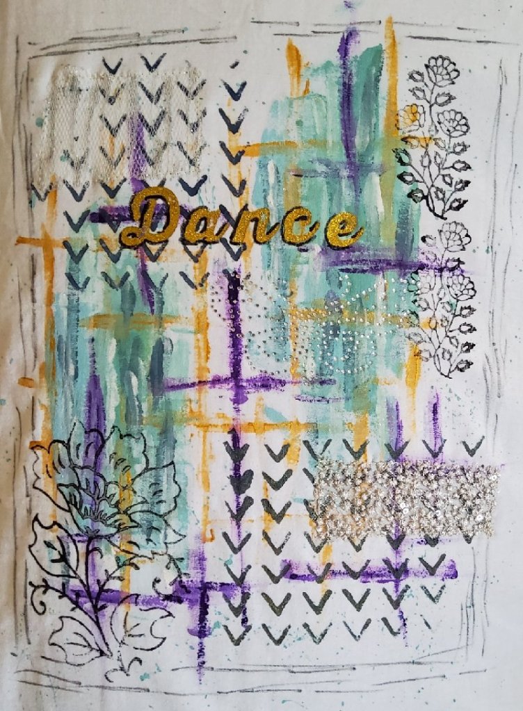 This one has been layered like the first one using textile paint, stencils, stamps and iron-ons.