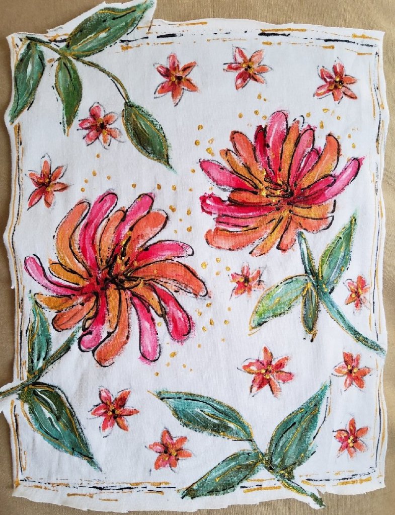The shirt above has just been painted with flowers inspired by the beautiful acrylics by artist Kathleen Rietz.