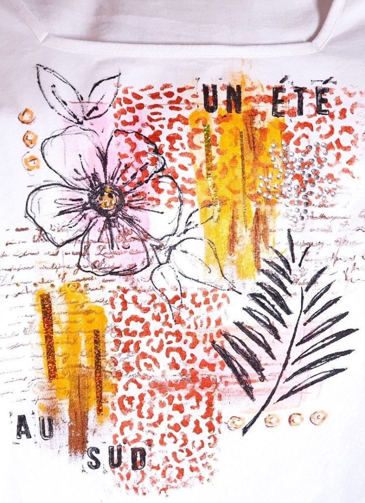 Das Shirt aus Leinen-Flammgarn bekam applizierte alte Stickerei und Schnörkel aus goldfarbener Plusterfarbe.