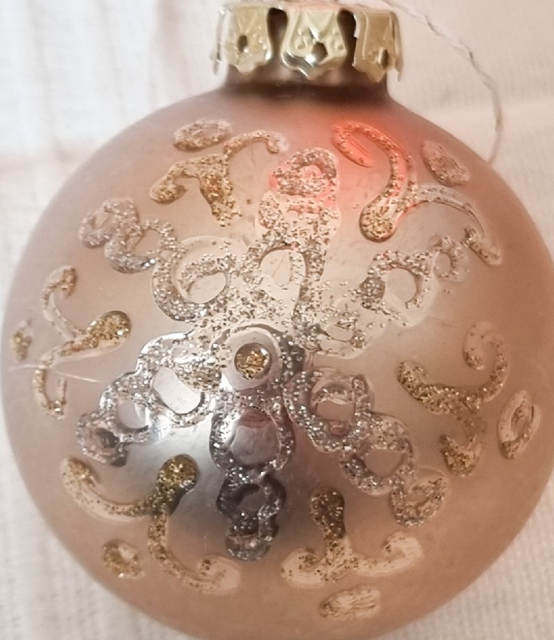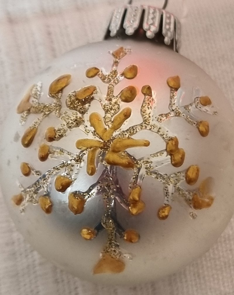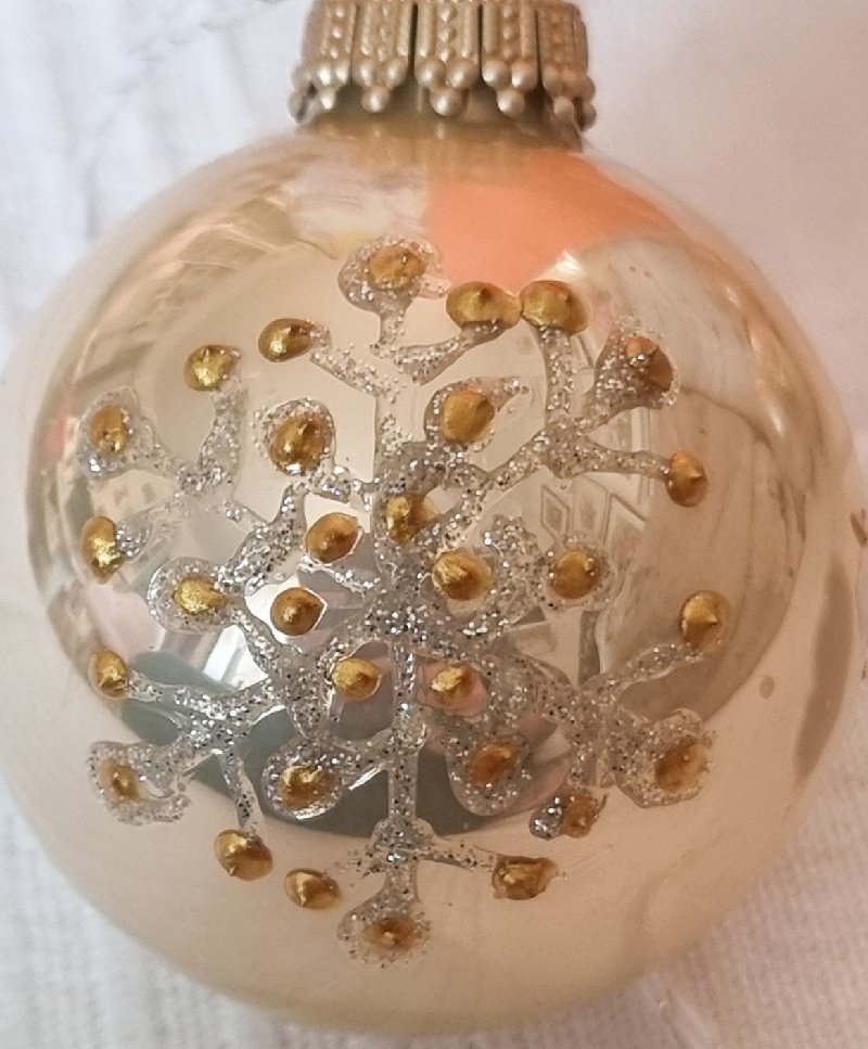 Außerdem habe ich ein paar alte Weihnachtskugeln mit Schneeflocken aus Metallic- und Glitzerfarbe verziert: