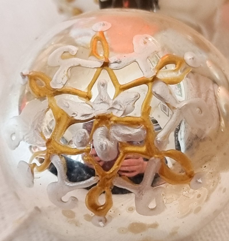 Every bauble sports two identic snowflakes on the opposite sides. As you can see, I’ve stayed true to my colour scheme of this year: „white, silver and gold“. This way they perfectly match the wooden Advent scenes.