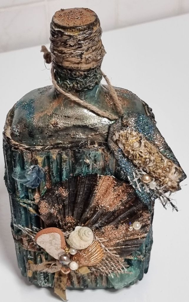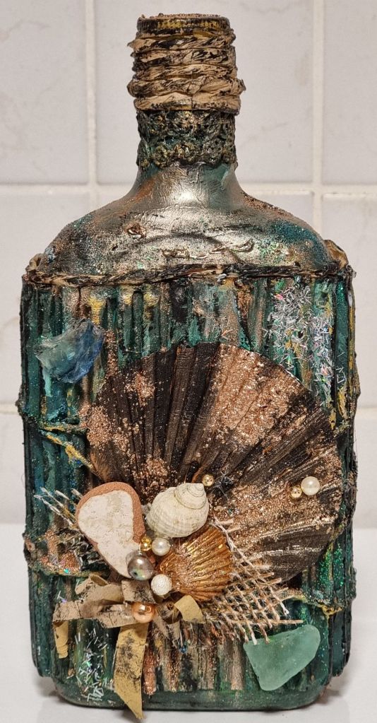 Nach Auftragen von Gesso und teils Strukturpaste habe ich die Vorderseite mit Acrylfarbe bemalt. Die Rückseite wurde so bemalt und gestaltet, dass es aussieht, als klebe Sand daran. Nun, mit leeren Flaschen habe ich in Zukunft noch einiges vor – mit oder ohne Likör!