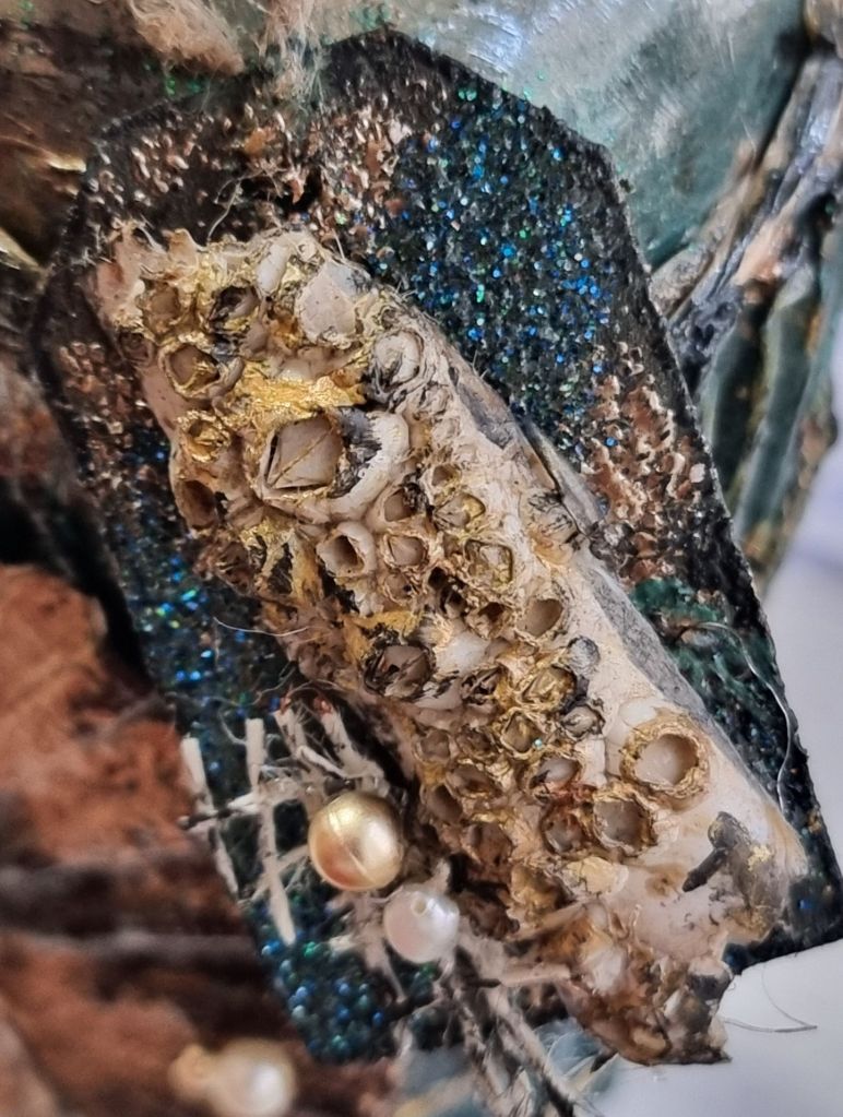 Here, I’ve cut a high candle holder glass to get two out of one: the stem has been turned foot up! The baselayer is air dry clay on a small wooden tablet, added shells and sea glass make for the maritime look. For durable hold and to create the impression of „water“, I’ve again covered everything with resin.
