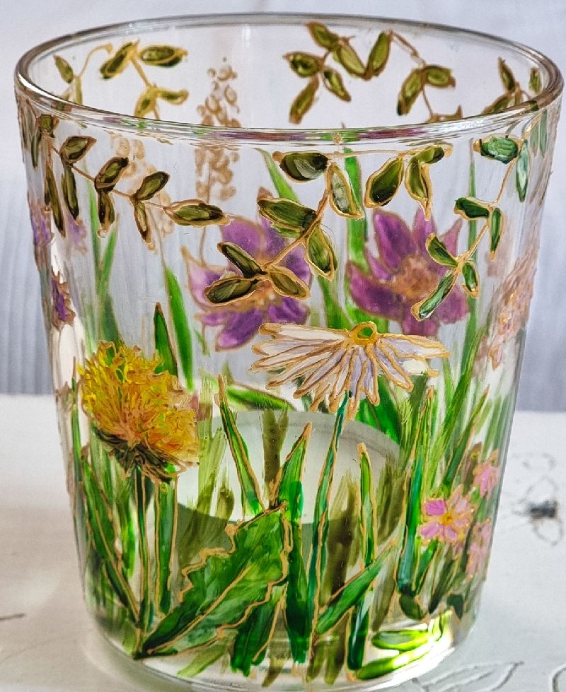 The large glass vessels above are for tea candles. The colours I’ve used have to be baked in the oven on 160°C to get resistant enough for the dish washer. Nevertheless, I’d always wash painted glass items by hand…