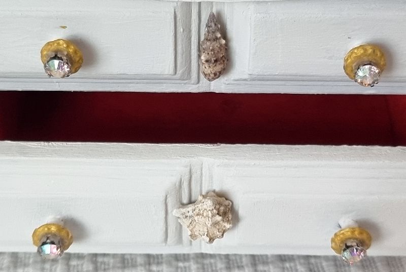 This small vintage jewelry box got a fresh look with paint and shells. Here I opted for super glue to make it last – it will be a gift for my granddaughter… Below you see more details and the inside: