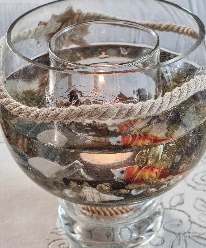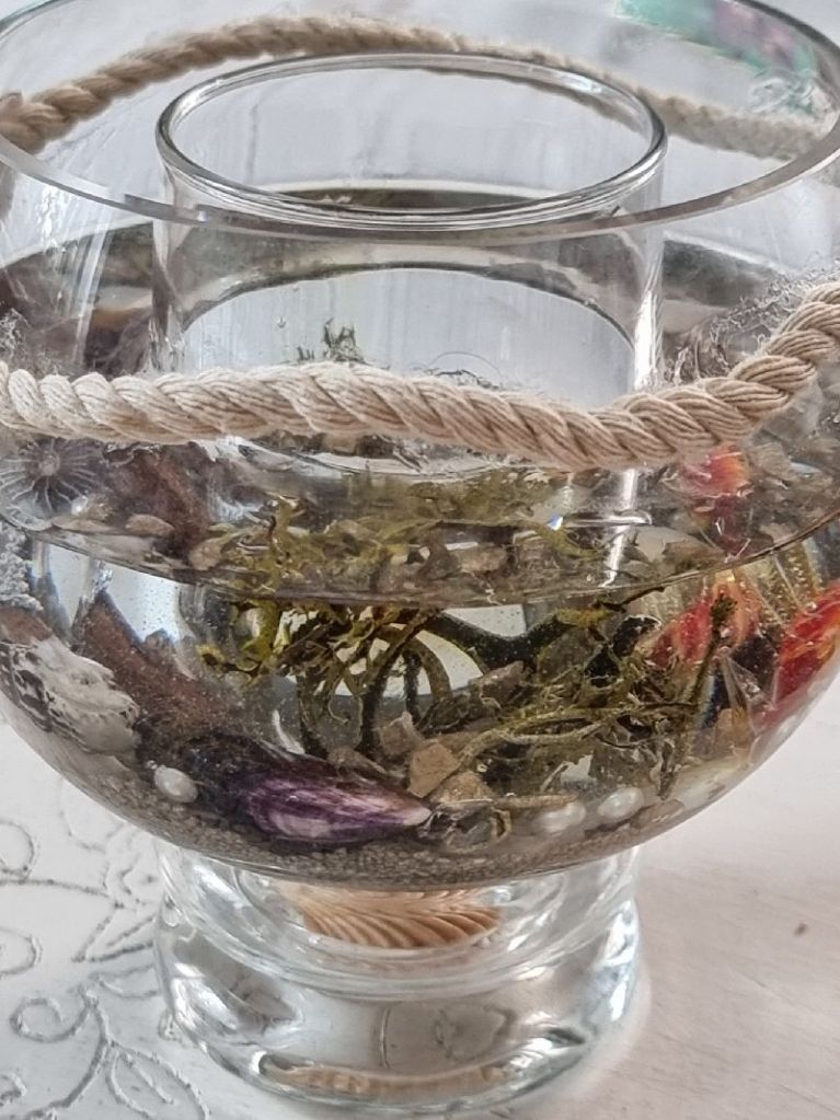 The following items also are my first try at working with resin. The first piece is a tea candle holder consisting of two glasses in different sizes, the smaller one glued into the large one. The space between them contains sand, small pebbles, sea shells, tiny bits of driftwood, a bit of Iceland moss (creating the impression of algae) as well as a small glass fish, also a thrift store find. All this has been caught in resin.