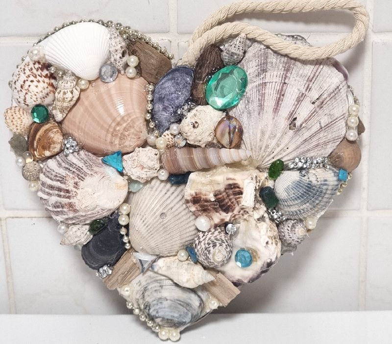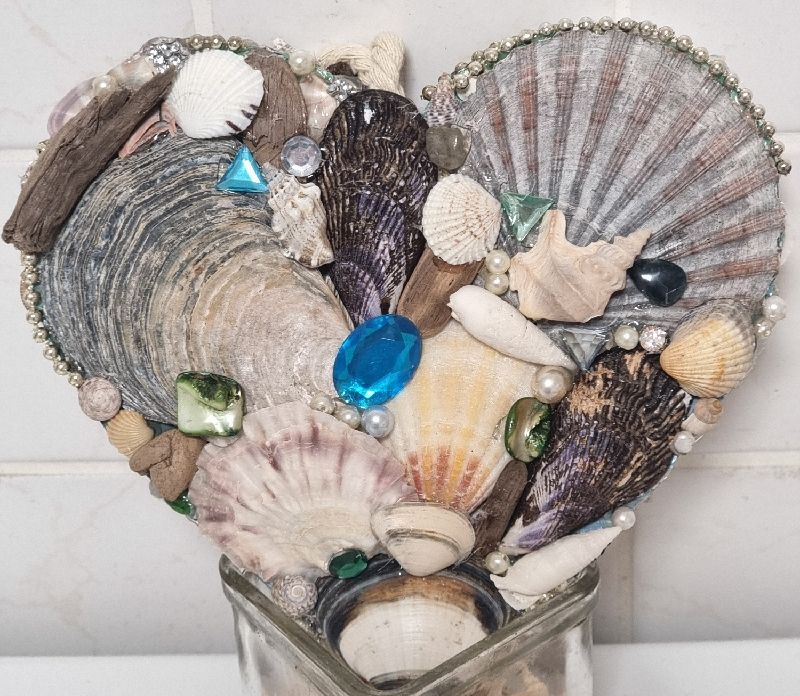 Aus solchen „second hand“-Muscheln habe ich in letzter Zeit einige sommerliche Deko-Objekte etc. gebastelt. Das Herz oben ist beidseitig gearbeitet, auf einer Basis aus robuster Pappe. Wie für die meisten Objekte habe ich Heißkleber verwendet. Und natürlich darf auch ein bißchen „Glam“ in Form von Perlen und Glitzersteinen nicht fehlen!