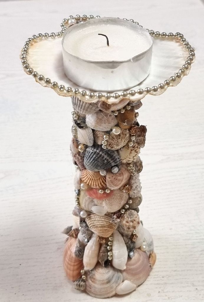 An old candle holder has been embellished the same way – thanks to a scallop found in one of the purchased bulks, it can now be used as jewelry dish or for tea candles!