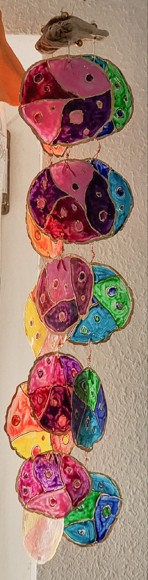 Zuletzt habe ich einen Haufen dünne, durchsichtige Perlmuttscheiben (Capiz) aus dem Sozialkaufhaus mit Glasfarben bemalt und daraus ein Mobile gemacht. Ich habe noch einige Ideen für Muscheln, die ich im Laufe der Zeit verwirklichen werde…