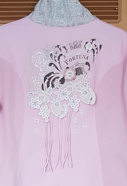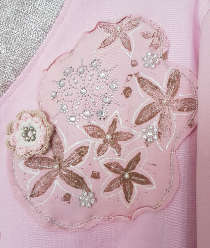 Auf der Rückseite habe ich den ausgeschnittenen Druck eines alten T-Shirts platziert, der ja perfekt zum Farbschema der Jacke passt. Auch hier kamen zusätzlich Glitzersteine, Häkelblüte und Spitzenmotive hinzu; außerdem kleine Blüten mit dem Stoffmal-Liner aufgetragen und rosa Fransen aus T-Shirtstoff. Im Übrigen soll die Jacke ja leicht sein, daher habe ich sie nicht ganz gefüttert, sonder nur das Rückenteil – das mache ich gerne, damit nichts auf dem Pulli oder Shirt darunter hängen bleibt, so ist es einfach viel bequemer. Nun braucht es nur noch eine Gelegenheit zum Ausführen!