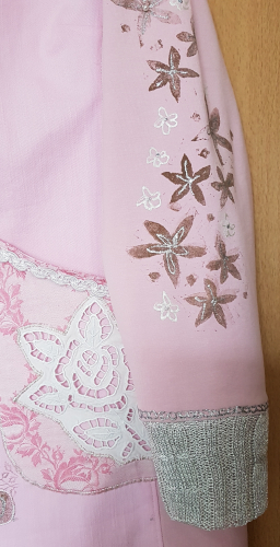 Natürlich habe ich mich ansonsten wieder mal richtig kreativ ausgetobt: die aufgesetzten Taschen bestehen aus rosa Baumwolldamast mit Rosenmuster, außerdem habe ich diverse alte Spitzen verwendet, gehäkelte Blüten, Schleifchen, Aufbügelmotive aus Glitzersteinen, Perlchen, unterschiedliche alte Metallic-Knöpfe in Silber… Vor allem aber habe ich das Vorderteil und einen Ärmel bedruckt: hier kamen nach langer Zeit mal wieder die echten, alten Druckerei-Buchstaben zum Einsatz, die ich vor Jahren auf einem Flohmarkt gefunden hatte. ich besitze kein Alphabet – das wäre zu schön (und zu teuer!) – , aber alle Buchstaben, die ich für meinen Namen brauche sowie ein paar Zahlen. Dabei bestehen die Buchstaben wahllos aus großen und kleinen sowie aus unterschiedlichen Alphabeten. Eigentlich sollen sie nur Stilmittel sein, doch als augenzwinkerndes Element habe ich sie so angeordnet, dass sie bei genauem Hinsehen von oben nach unten meinen Namen ergeben. Damit das nicht allzu offensichtlich ist, habe ich sie mal gerade, mal seitlich und mal umgedreht positioniert. Die kleine Schrift daneben ist mit meinen kleinen Alphabetstempeln entstanden und lautet : „Fashion Statement“ – was zu dieser Jacke ja definitiv passt!