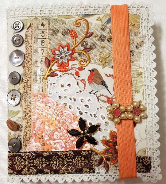 The cover is made from a vintage flower fabric which shows on the back – having embellished the front using vintage papers, fabric sccraps, lace, borders, vintage buttons, flower appliqués, a bit of handstitching and a vintage brooch. The elastic holding it closed is handdyed and also shows a vintage brooch.