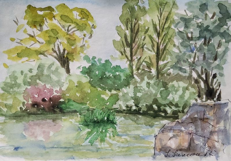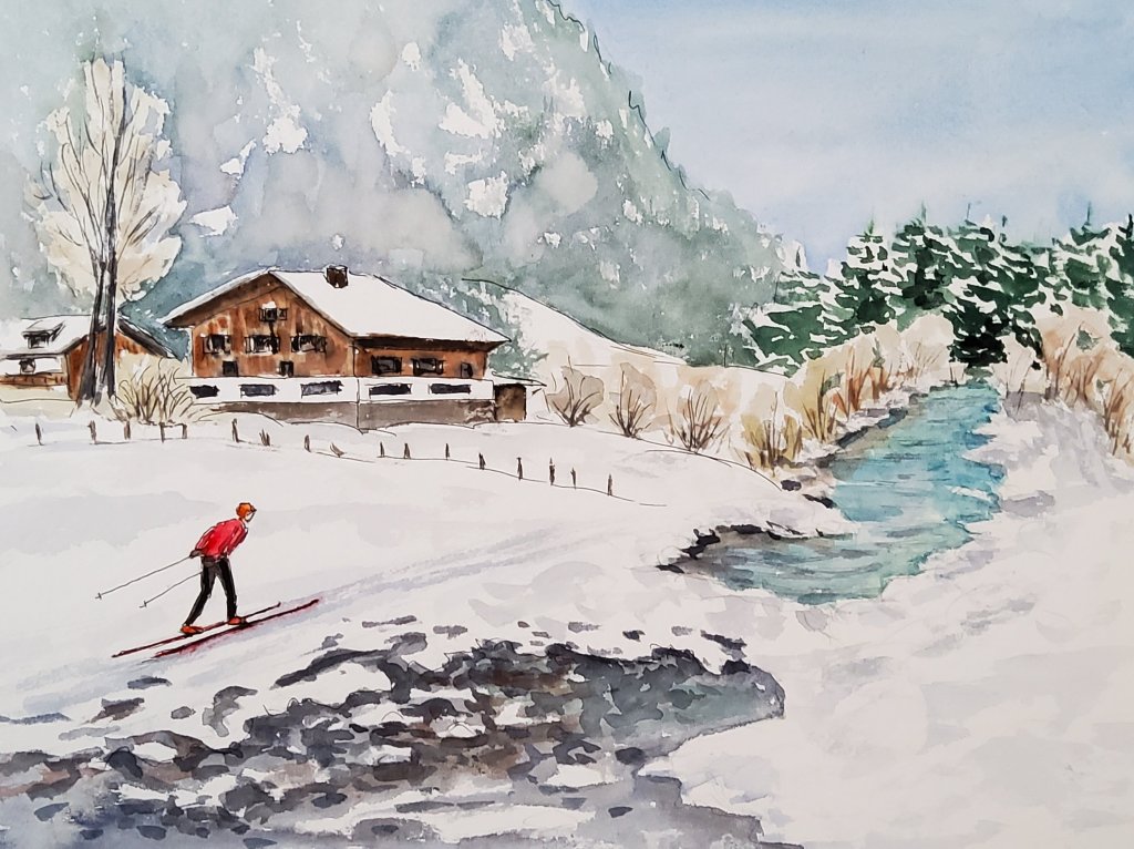 The picture above is a free interpretation of a reference photo taken in the Engelberg Valley by my daughter. Below a small sketch I’ve done at my Mum’s place – not having brought my equipment, I’ve used an old watercolour palette of my father’s, as well as paper and brushes which actually weren’t suitable for watercolour. But it was a challenge to improvise.