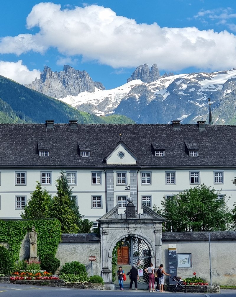 Kloster Engelberg, im Hintergrund Groß- und Klein Spannort/Engelberg monastery, the dented mountains in the background are called Groß (big) Spannort and Klein (small) SpannortIn den Straßen von Engelberg/the streets of Engelberg Die Aa im Engelberger Tal/creek in the Engelberg Valley